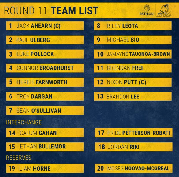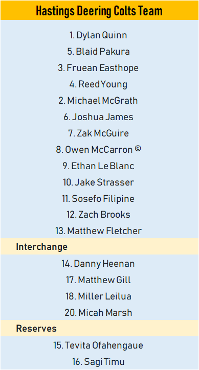 1. David Fauid 2. Namilla Davui 3. Henry Penn 4. Sam Collins 5. Luke Archer 6. Simon Brittain-Snowden 7. Brad Frith 8. Joe McGuire 9. Liam Horne 10. Patrick Akaoula 11. Joe Bradley 12. Iian Riccardi 13. Moses Noovao-McGreal 14. Jack Miers 15. Jordan Mago 16. Jacob kelly 17. Dylan Tavita