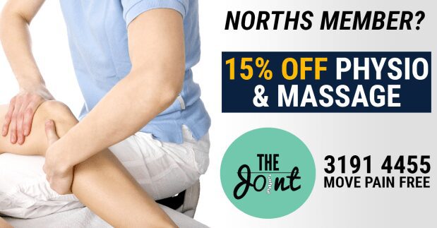 The Joint Physiotherapy – Present your Norths membership card in clinic to receive a 15% discount on remedial massage (normally $93) and physio services (normally $93) for 2019.