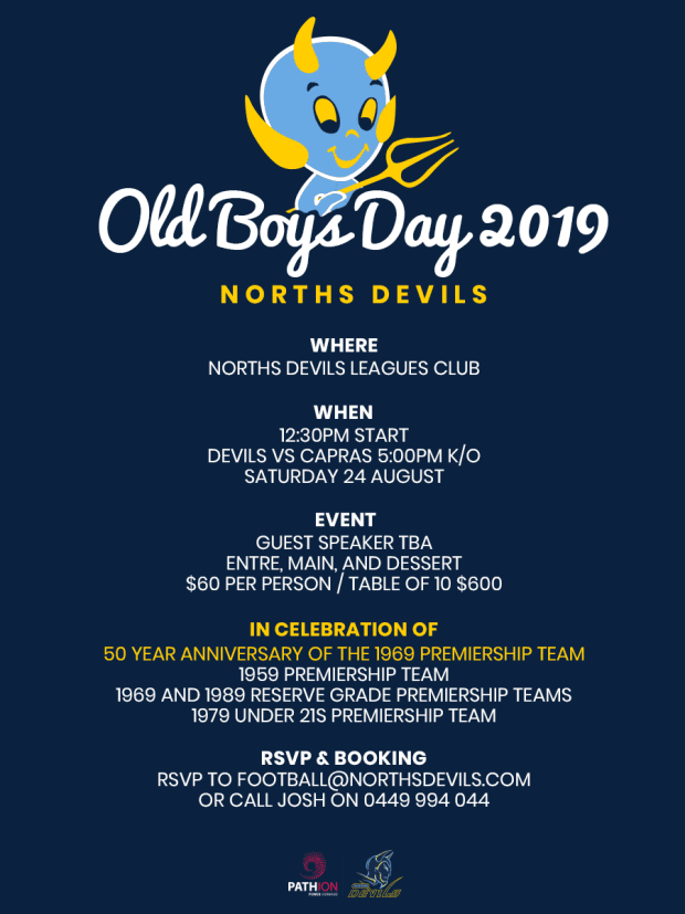 Our 2019 Old Boys Day will take place on our final home match of the season which is Sat August 24 – Devils vs Capras.