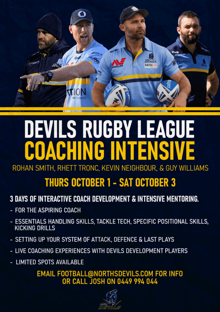 For aspiring Rugby League coaches looking to expand your knowledge and coaching skills this is a rare opportunity to learn from our experienced coaching staff. Email football@northsdevils.com with your interest for more information or complete the form below: