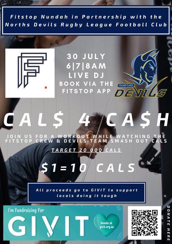 Fitstop Nundah is raising funds for locals doing it tough, and the Devils are right behind them. The Fitstop Nundah crew supported by the Devils team will smash out 10 calories for every $1 donated on Saturday 30th of July, with all proceeds being donated to GIVIT. The more that is donated, the more they’ll have to do!