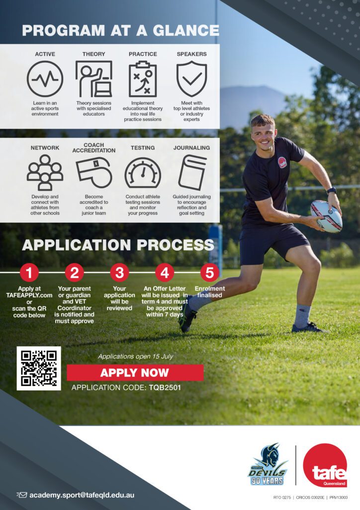 Successful applicants will attend the program one day per week at Norths Devils Leagues Club, integrating this specialized training into their regular senior high school experience. Students can earn up to 8 QCE credits and contribute to their ATAR, participating in a unique sports education program that blends coaching and development.